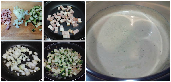 Ahora vamos a preparar la salsa. Cortamos el bacon y las verduras (el calabacín lo podéis pelar entero, yo he preferido pelarlo solamente a medias). Ponemos una sartén al fuego, cuando esté bien caliente añadimos unas gotitas de aceite y freímos el bacon hasta que quede crujiente. Retiramos y en ese aceite freímos la cebolla y el calabacín, salpimentamos y lo dejamos al fuego hasta que estén dorados. Pasamos la verdura al baso de la batidora, añadimos la nata (crema de leche) y trituramos. Colamos la salsa y la pasamos a un cazo, calentamos y rectificamos de sal si es necesario.