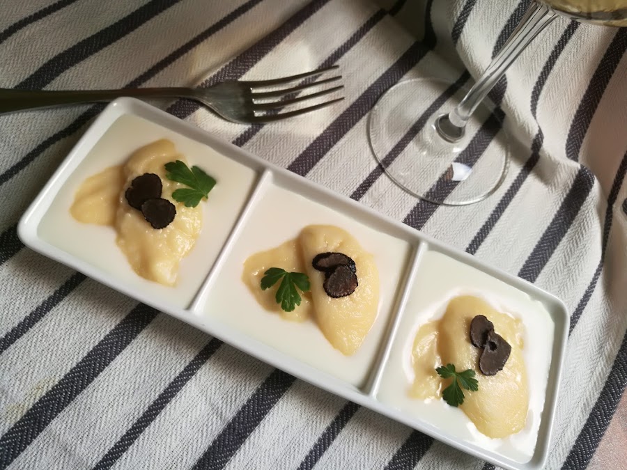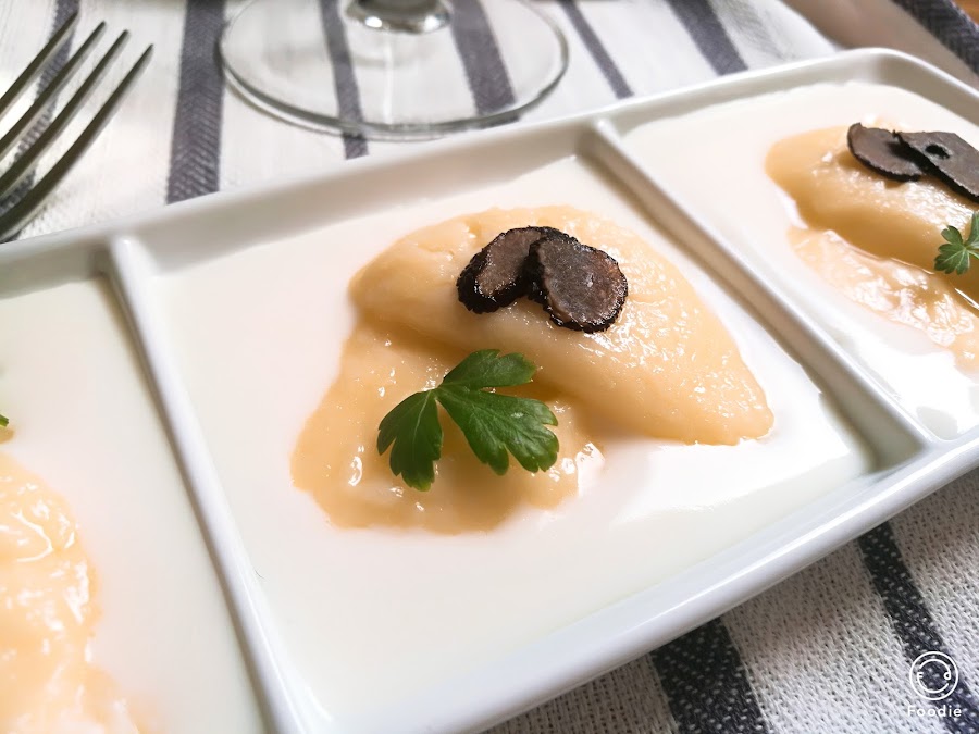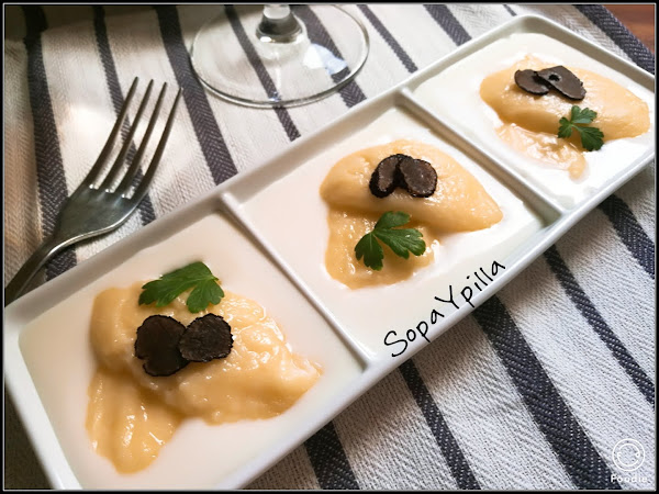 - Disponemos las "bolas" de queso en el caldo y decoramos con las lascas de trufa y alguna hierba fresca. (yo perejil)