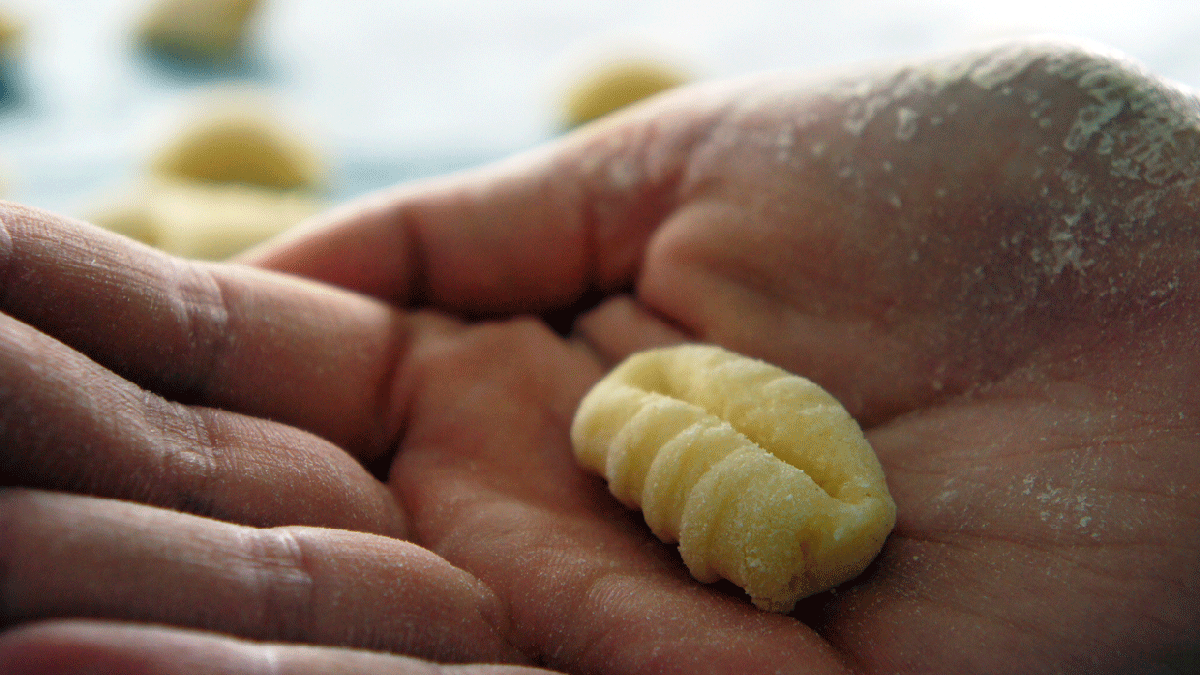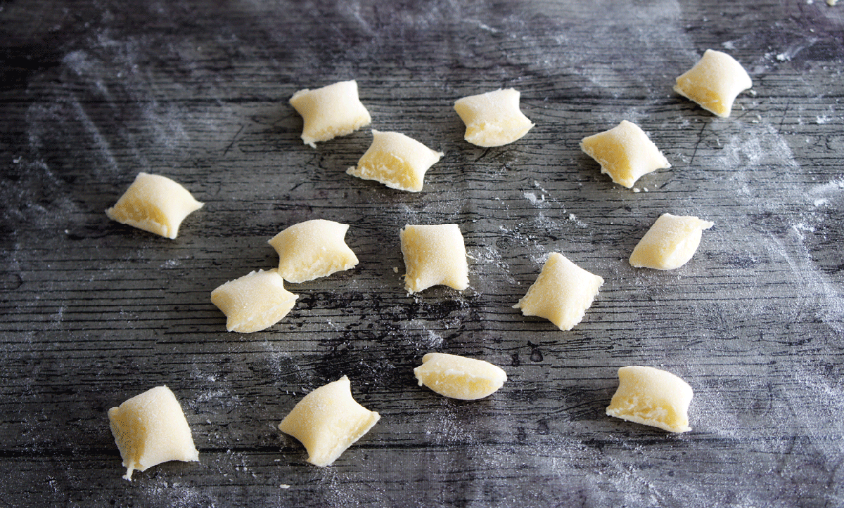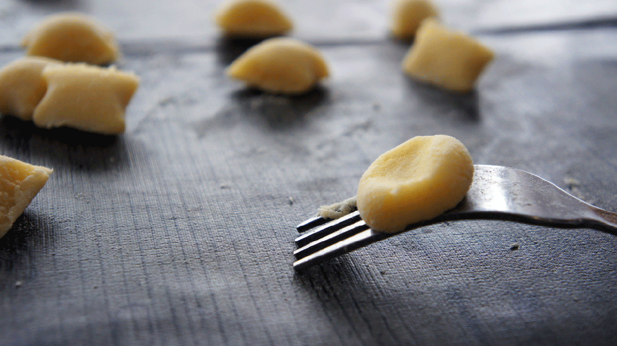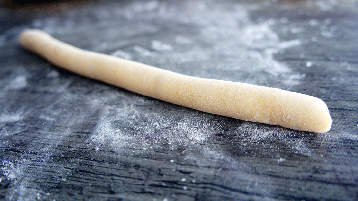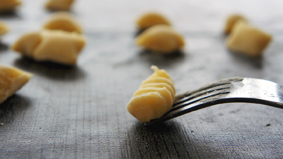 Cortamos un trocito de masa y en una encimera enharinada hacemos un rollito de un centímetro de grosor aproximadamente. Cortamos el rollito con ayuda de un tenedor en trocitos de también un centímetro de grosor.