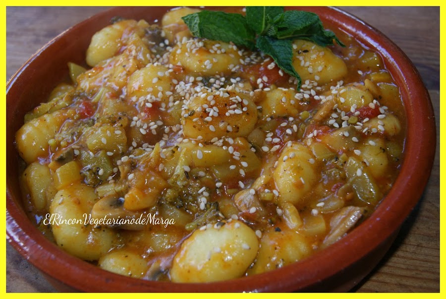 Cocinamos durante 10 minutos y le incorporamos los gnoccis, la sal y las especias.
