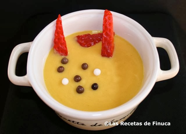 Cuando el zumo de la cazuela empiece a hervir echar el puré del bol. Revolver con una cuchara de palo hasta que esté espeso. Repartimos en recipientes. Se puede servir templada o fría. Decoramos con trozos de fruta, chocolate o un poco de cada cosa