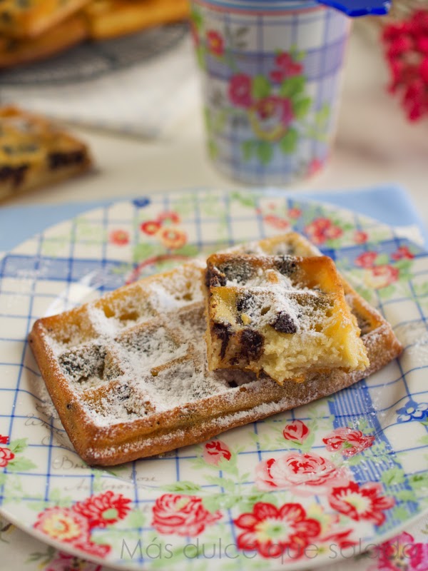 Esta versión que os propongo no tiene nada que ver con los gofres que todos conocemos, los de los puestecillos de Navidad o de la Feria, o los que has podido tomar sí has estado en Bélgica. No llevan azúcar perlado como los originales, y el sabor tampoco es el mismo. Pero os puedo decir que están muy ricos, con el punto justo de dulzor, no necesitan nada , simplemente un poco de azúcar glas o incluso se pueden tomar tal cual.
