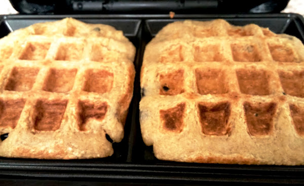 Encendemos la gofrera y cuando esté caliente, untamos las placas con aceite de oliva virgen extra y vertemos nuestra mezcla y dejamos que se haga. Yo los dejé unos 7 - 8 minutos más o menos, pero esto dependerá de la potencia de vuestra gofrera, hasta que tengan mas o menos esta pinta: