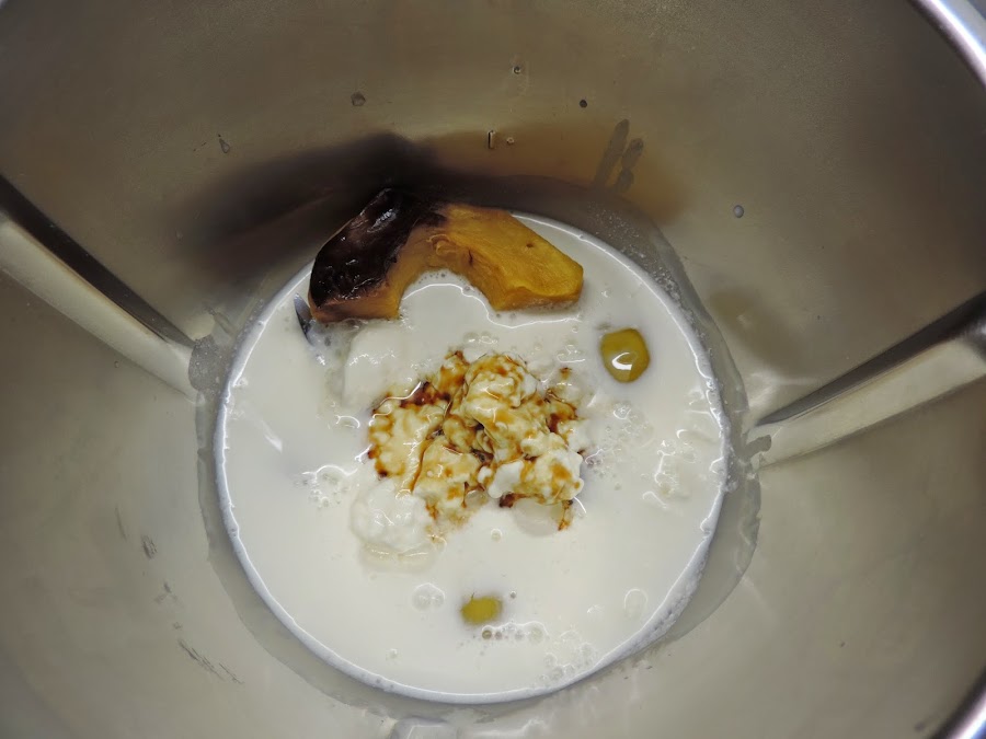 Poner en el vaso del thermomix, la leche, nata (crema de leche), huevos, calabaza y vainilla.