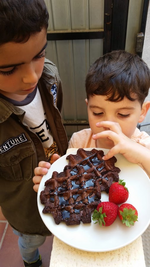 Enchufamos la gofrera, untamos un poco de aceite de oliva para que no se peguen, una vez caliente ponemos la masa y hacemos los gofres (en mi máquina han tardado 5min, ya dependiendo de cada máquina.