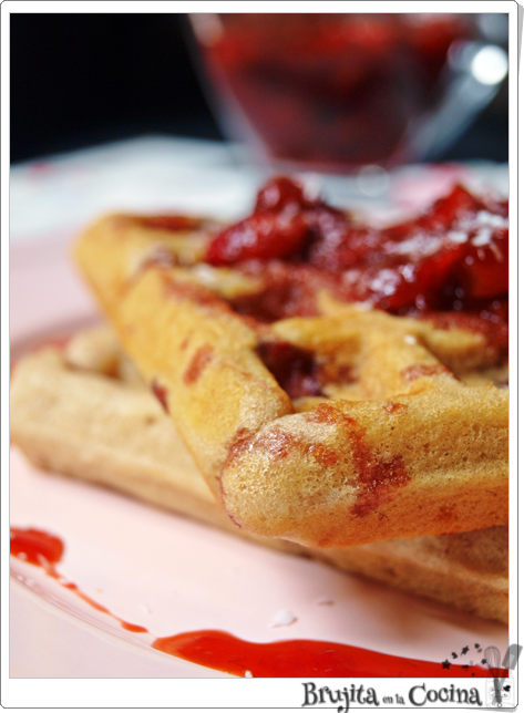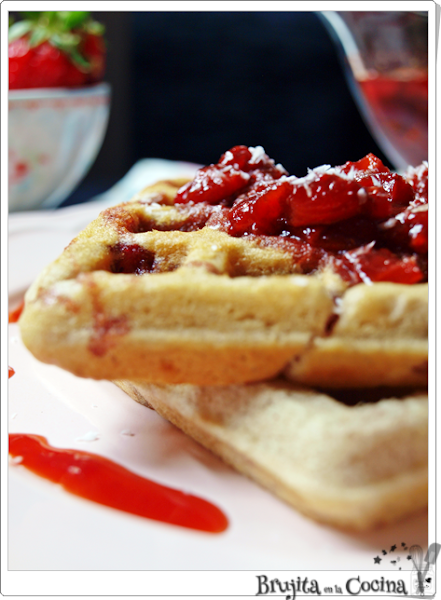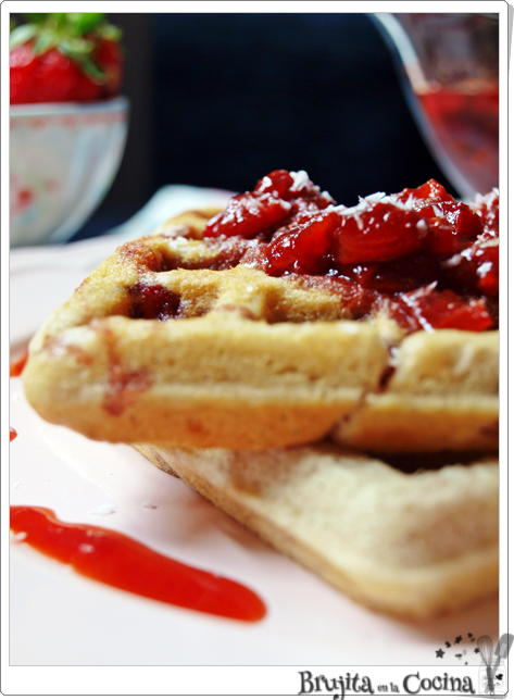Lo que pasa que no quería que fuese de fresa tan tradicionales quería darle una vuelta de tuerca y como tenía leche de coco abierta, pensé en la piña colada, pero sustituir la piña por fresa?? Esto tiene que estar bueno?? Me lo imaginé fresa, coco, ron... Fresa colada. Tiene que estar riquísimo, así que al lío. Y este es el resultado, decir que están bueno posiblemente es decir poco, los gofres supertiernos y esponjosos, la fresa dulce y blandita, si es que se deshace en la boca, no hace falta casi ni masticar.