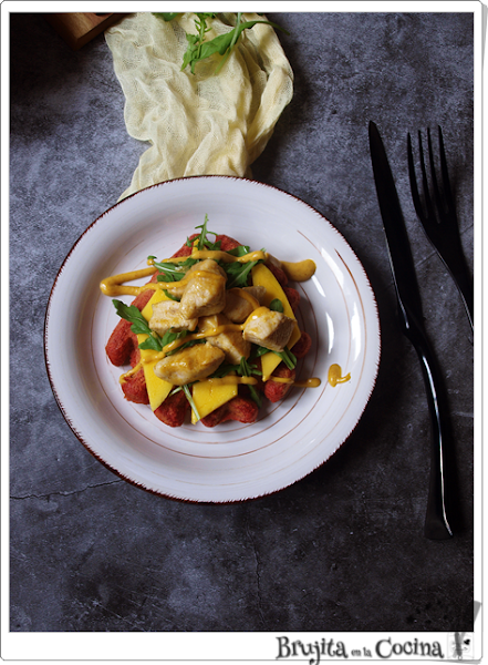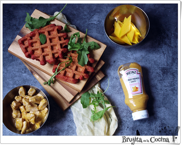 Para el montaje, ponemos sobre el gofre láminas de mango,un poco de rúcula y después el pollo, rociamos con salsa curry-mango y listo para comer.