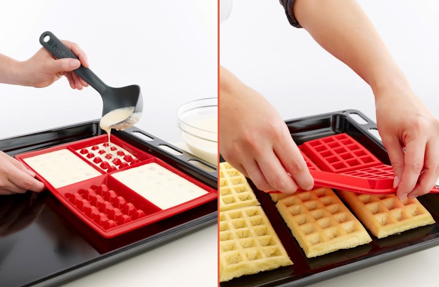 Batir los huevos, cuando estén bien batidos echar el queso y batir bien. Ir echando todos los ingredientes poco a poco y batir bien sin que queden grumos. Los podéis hacer en la gofrera o en los moldes que hay para el horno. Si lo hacéis en el horno como veis en la foto, cuando estén hechos hay que darles la vuelta en la bandeja del horno y volverlos a meter para que se doren.