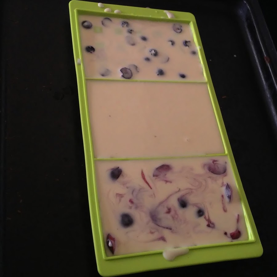 Añadimos el cacao el polvo si los hacemos de chocolate reduciendo la cantidad si los hacemos mixtos. Si los hacemos de frutas las añadimos dejando que tinten un poco la masa, quedarán más bonitos.
