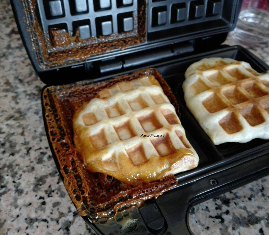 Sandra ya advertía que rellenarlos de mermelada no era buena idea porque se salía todo y ponía la gofrera pringosa, pero como no se escarmentar en cabeza ajena los hice con mermelada. Puse muy poquita pero aún así quedó poca dentro del gofre y se debió multiplicar porque la gofrera y la encimera estaba.....