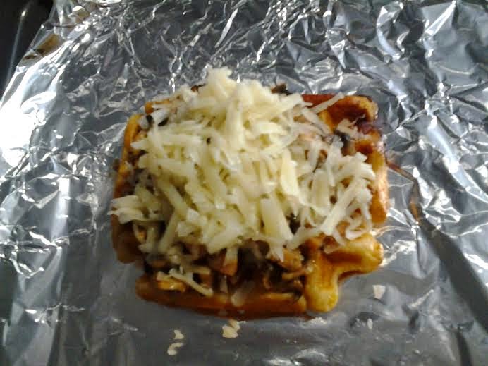 Rectificamos de sal y rellenamos nuestro gofre. Ponemos queso rallado por encima y gratinamos en el horno a 230º unos 5 minutos.