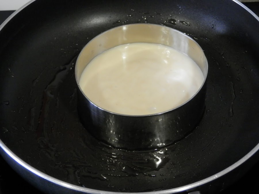 Pon un aro de emplatar en el centro de la sartén y vierte la mezcla.