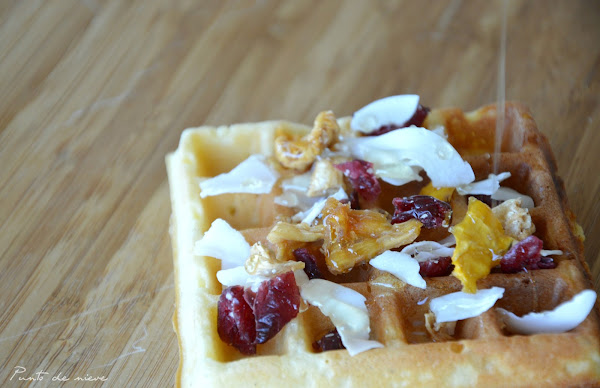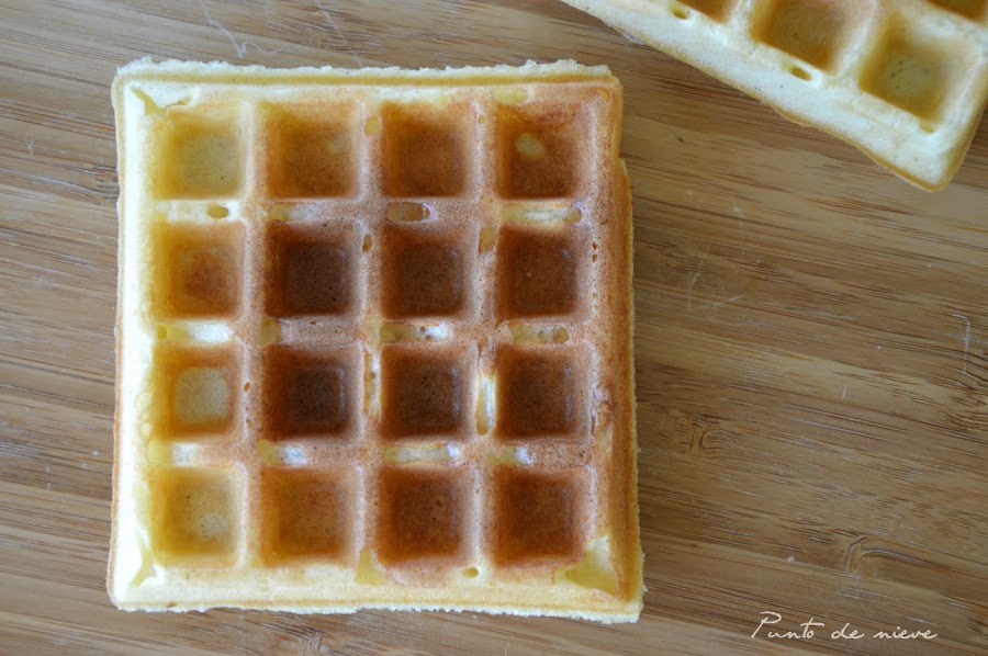 Calentamos la gofrera siguiendo las instrucciones del fabricante. Echamos suficiente masa como para cubrir la base, cerramos la plancha y cocinamos durante 3 o 4 minutos (aunque esto puede variar en función de vuestra gofrera). Los gofres estarán hechos cuando queden dorados y se puedan retirar fácilmente de la plancha.