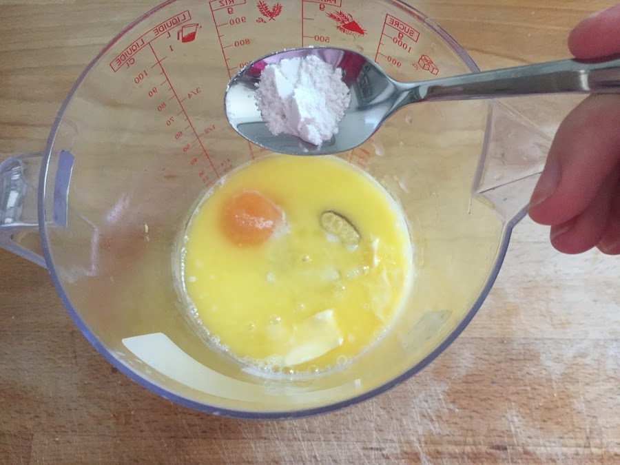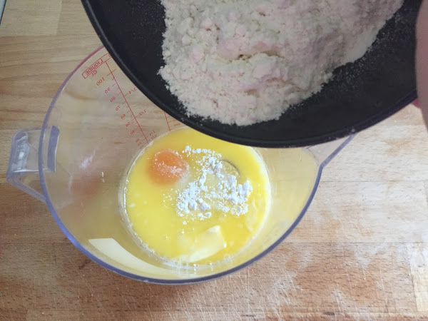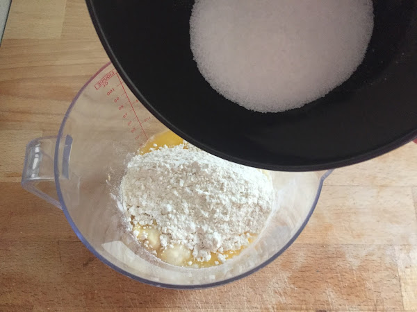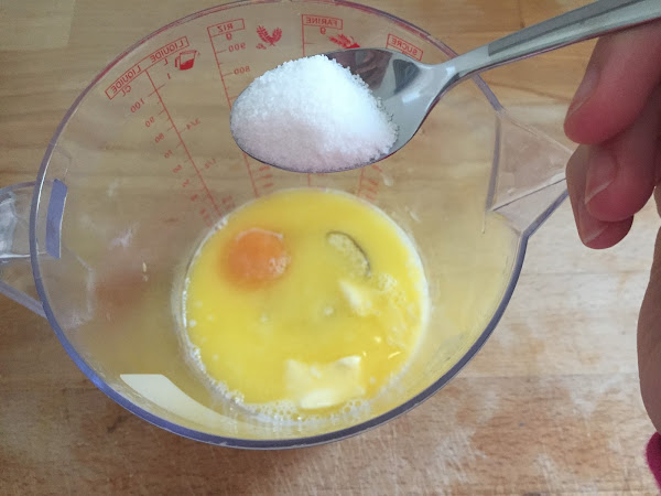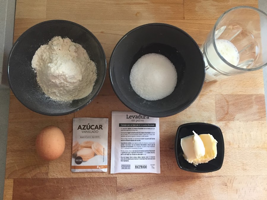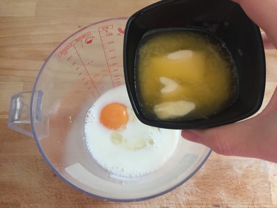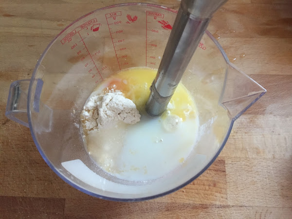 Primero ponemos los ingredientes líquidos en el vaso de la batidora, como la leche, el huevo y la mantequilla derretida. Poco a poco añadimos los ingredientes sólidos, como el azúcar vainillado, la levadurina, el azúcar y la harina; y mezclamos bien con la batidora hasta conseguir una masa homogénea y algo espesa.
