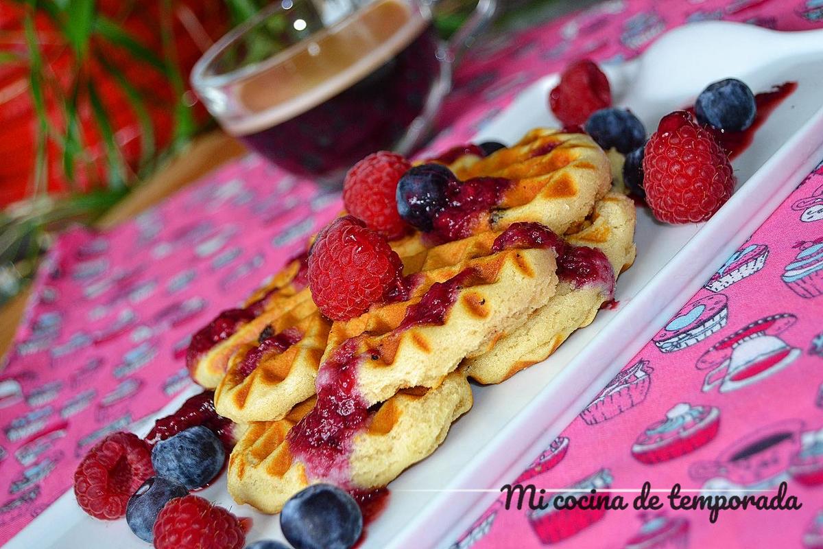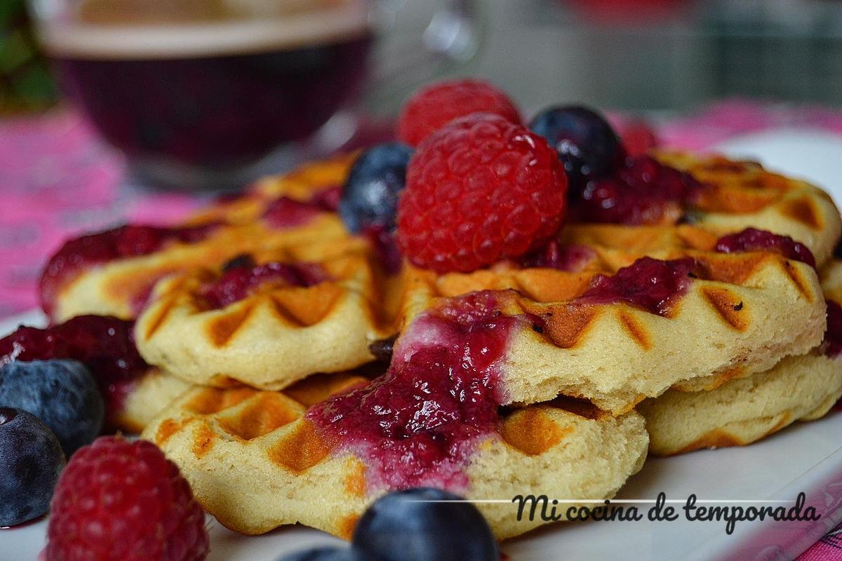 Encendemos la gofrera, la pincelamos con con aceite y vamos añadiendo masa y haciendo los gofres. Cuando ya estén los vamos sacando y los dejamos sobre papel absorbente para que no se ablanden.