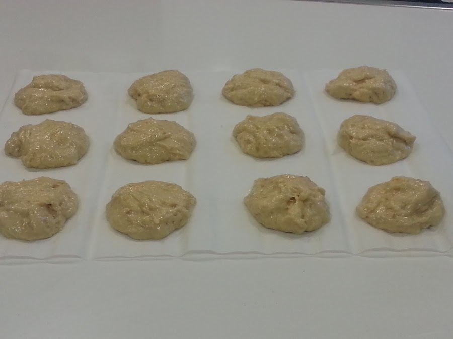 5. - Entonces, con las manos humedecidas con agua, haremos bolas de unos 100 gramos, a mí me han salido 12, y las ponemos sobre papel de hornear. Y dejamos otra media hora reposando.