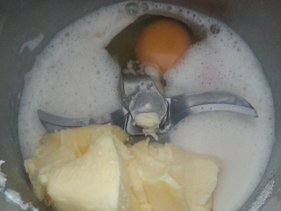 2. - Añadimos los huevos junto con el azúcar vainillada, la sal y la mitad de la mantequilla y mezclamos.