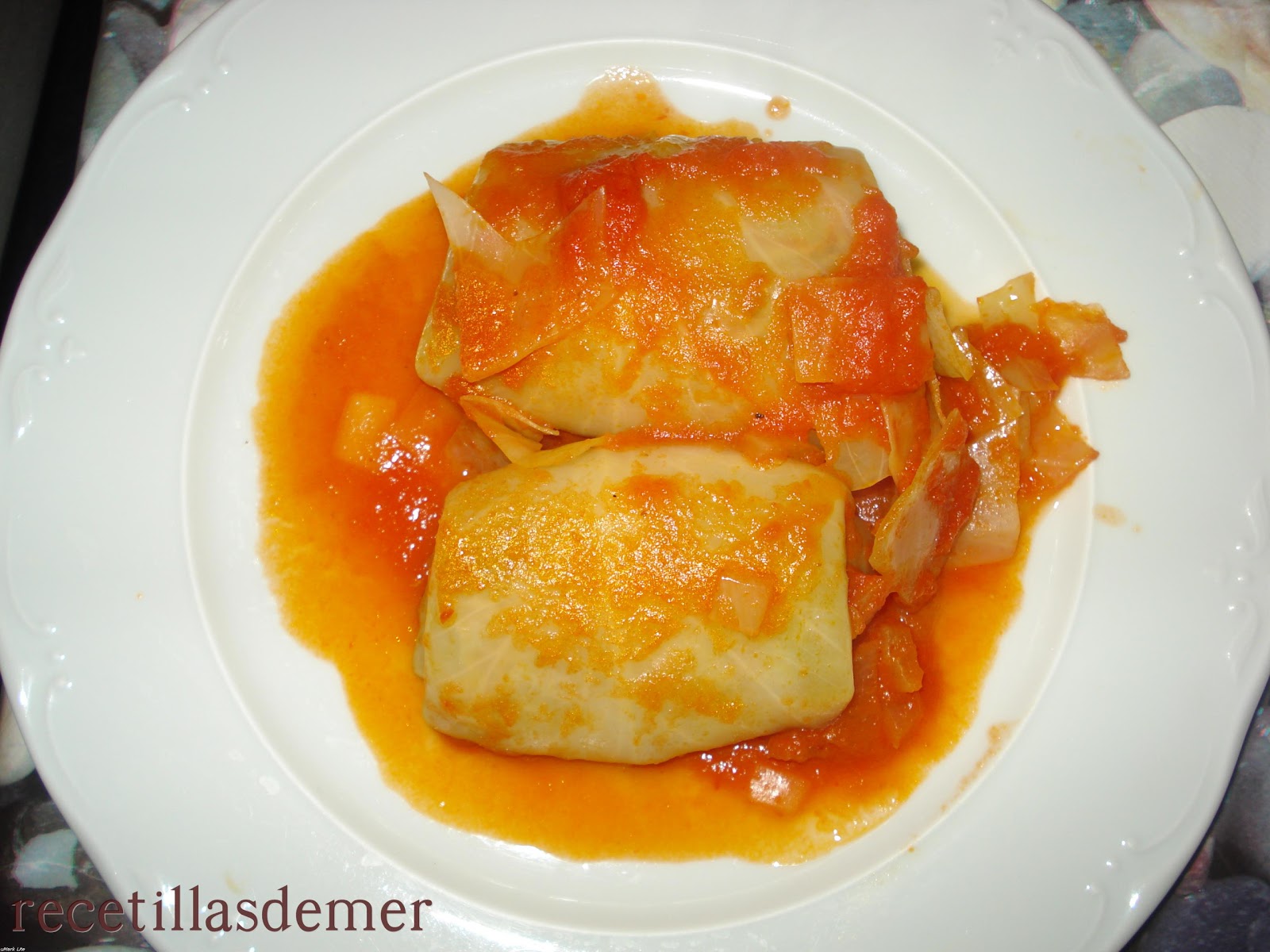 En una cazuela grande poner a pochar el resto de la cebolla con aceite de oliva y cuando este transparente añadir el tomate frito y salpimentar. Poner dentro con cuidado los paquetitos de col y cocer todo a fuego medio durante 30 minutos. Si durante la cocción, el caldo se redujera mucho, vamos añadiendo agua o caldo de carne poco a poco. Retirar del fuego pasado este tiempo y servir.