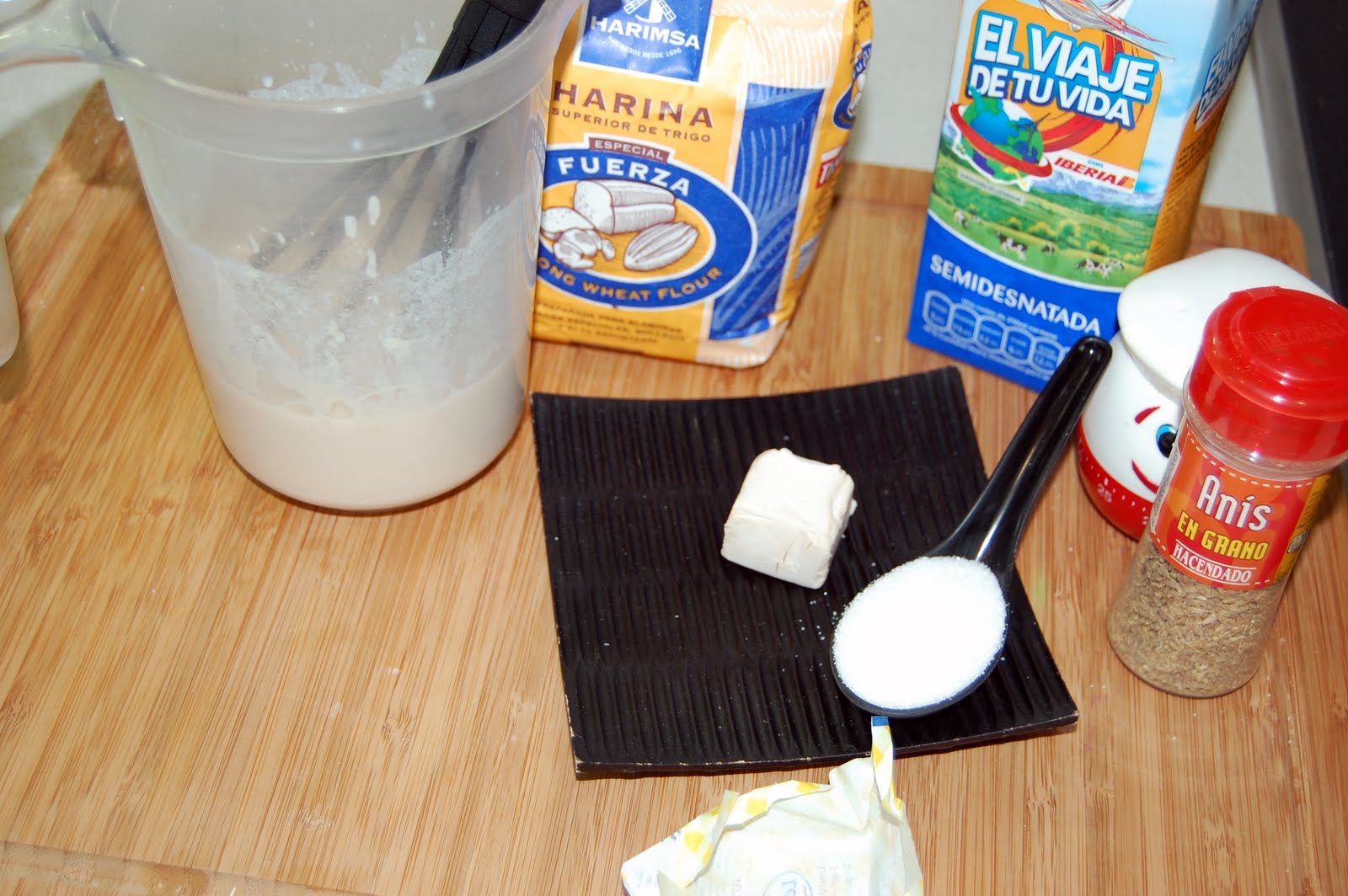 En primer lugar haremos un preparado para que la levadura haga bien su trabajo, calentaremos la leche hasta que este tibia, es importante que no esté demasiado caliente ,ni que le falte temperatura para que pueda fermentar correctamente, incorporaremos la levadura fresca desmenuzada, 50grs de la harina y una cucharada de azúcar, con unas varillas lo agitamos bien y lo dejamos en un recipiente en el que tenga espacio para aumentar su volumen, lo cubrimos con film y ponemos bajo un plato hondo por si se desbordase recogerlo comodamente.