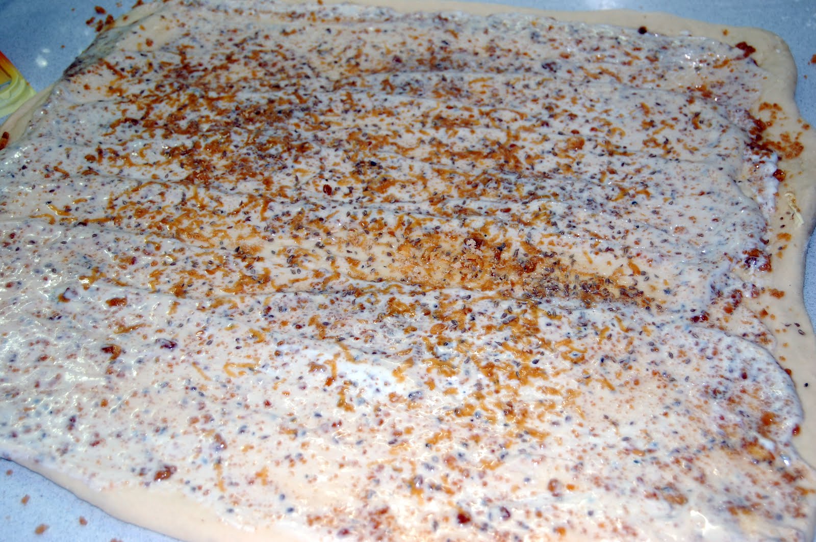Extendemos la masa ,dandole la vuelta un par de veces hasta darle forma rectangular, espolvoreamos con harina si es necesario, pero la mínimo posible, una vez lo tengamos pincelamos la masa con margarina.