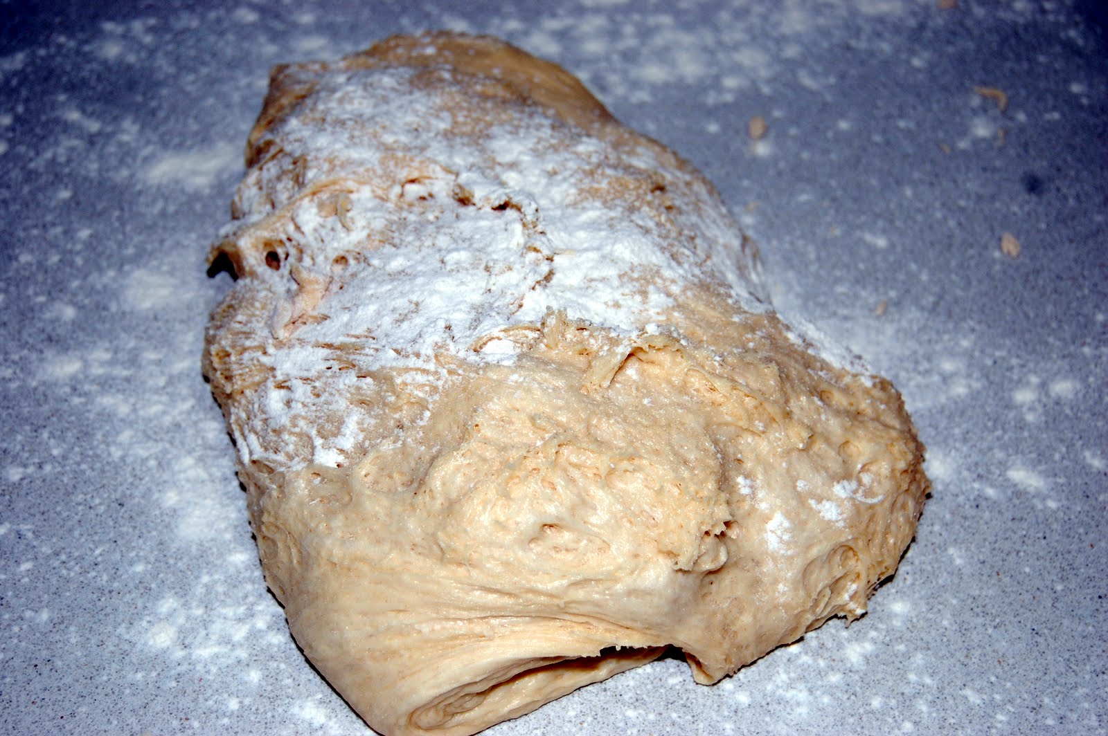 Una vez levada la masa ,enharimamos una superficie lisa y amasamos un poco para eliminar las burbujas de aire, enharinando un poco la masa si es necesario.