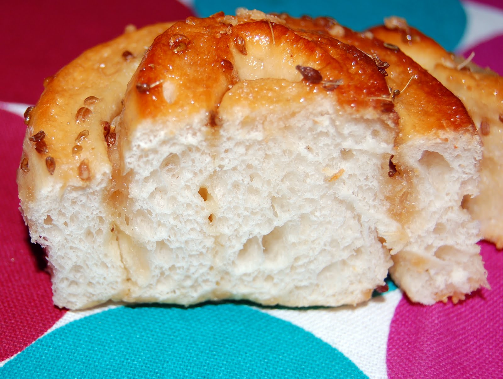 Troceamos el rollo en rodajas de 1"5cm y las colocamos sobre una hoja de papel de horno que habremos puesto en la bandeja de hornear.Las metemos en el horno apagado durante unos 15/ 20 minutos, mientras preparamos el melado con el que las pincelaremos.
