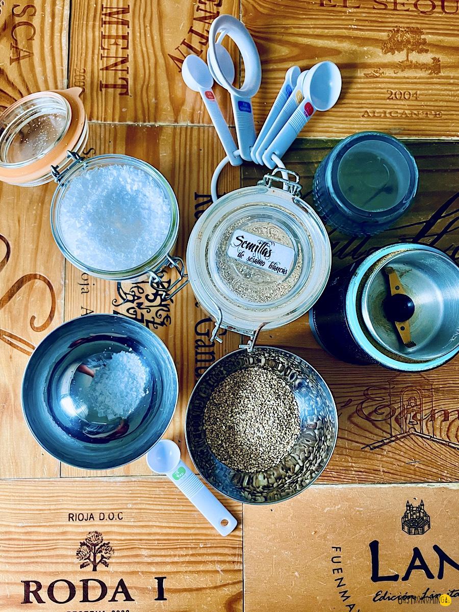 Además de conocer los beneficios de reducir el consumo de sal, por ejemplo, con esta mezcla, el ratio que usaremos será de 15 partes de sésamo por una de sal sin refinar, es decir, sal marina y sabiendo los aportes de las semillas de sésamo (ajonjolí) como sus poderes reconstituyentes, su aporte en grasa insaturadas, zinc, hierro, calcio y proteínas solo por nombrar unos pocos, existen estudios que dicen que el sésamo aporta 6 veces más calcio que la leche y 5 veces más hierro que la carne. La manera tradicional de hacer el gomasio es moliéndolo a mano con un mortero japonés conocido como suribachi, pero, como nosotros no lo tenemos, puedes hacerlo en un mortero normal o más rápido si lo haces en un molinillo de granos de café, como lo haremos nosotros.