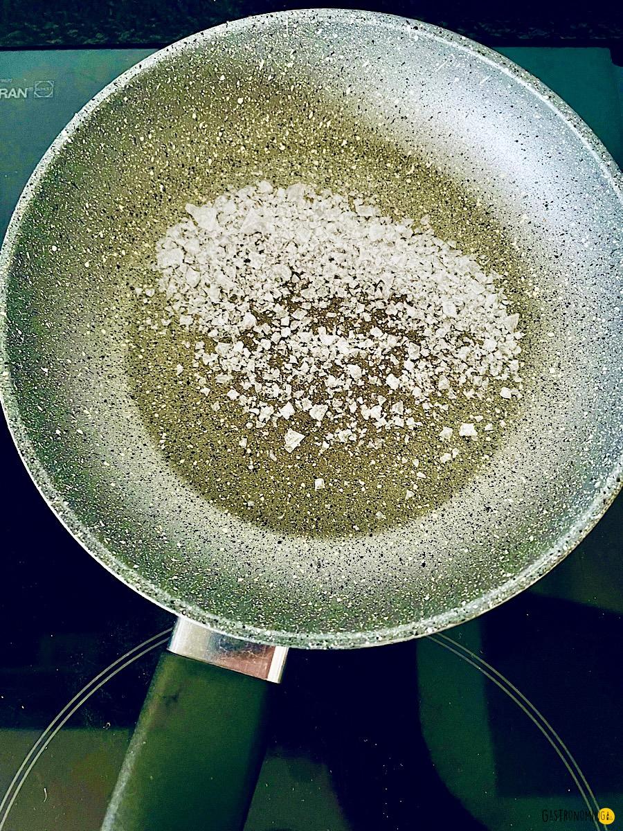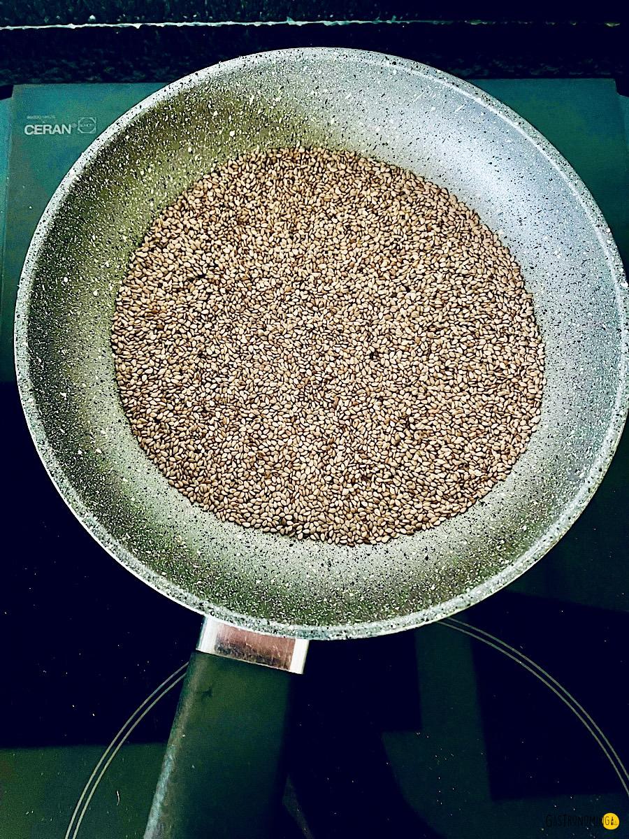 1. Ponemos una sartén a fuego medio y empezamos a tostar las semillas de sésamo moviendo constantemente hasta que cambien de color a un marrón tostado o hasta que empiecen a crepitar, así sabremos cuándo están listas, ten paciencia, esto puede llevarte al menos unos 10-12 minutos, la idea al hacer esto es deshidratar las semillas. Retiramos del fuego y separamos 2 cucharaditas para el final. A mi particularmente, me gusta bien tostado, más aromas y sabor.2. Ahora es el turno de hacer lo mismo con la sal y la tostamos hasta que empiece a coger un suave tono grisáceo, esto puedes hacerlo a mayor temperatura para ir más rápido.