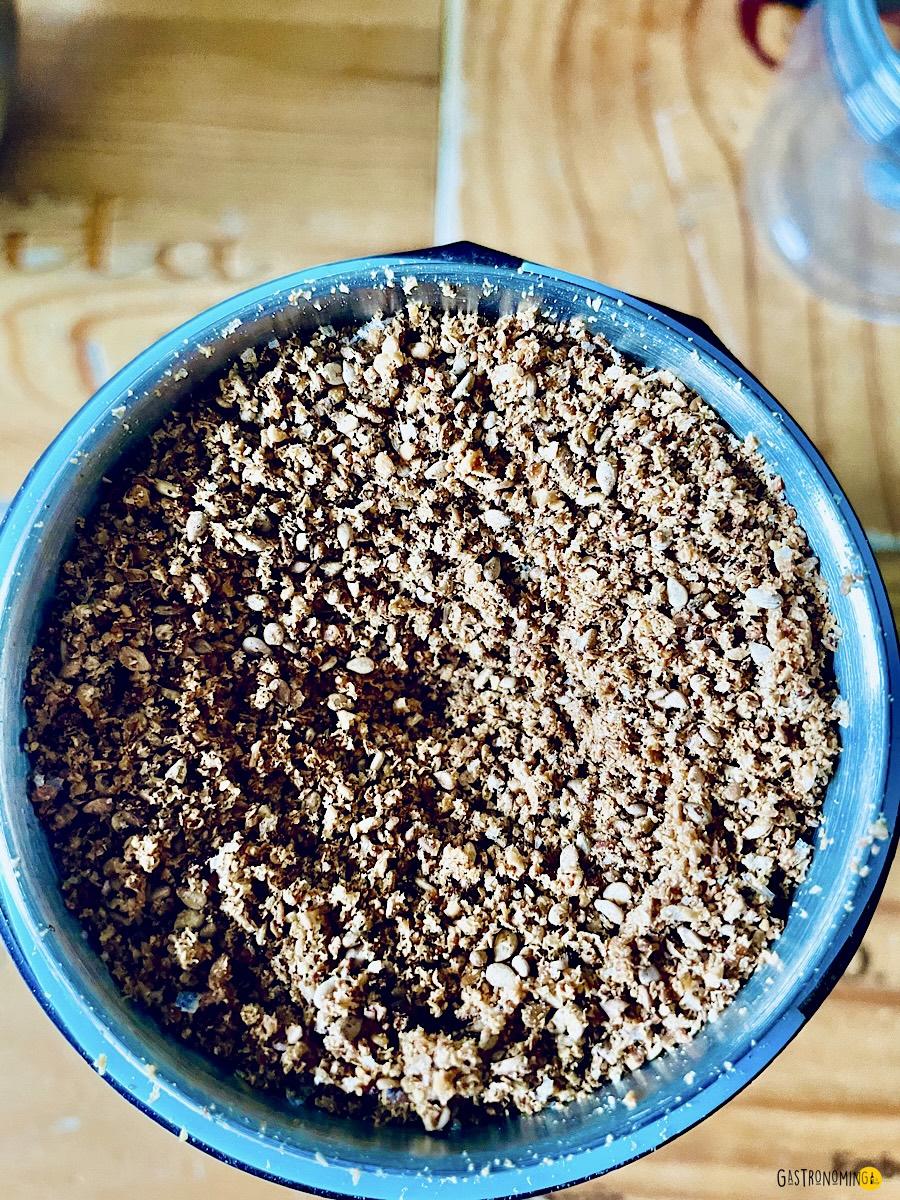 3. Es el momento de triturar, mezcla las semillas y la sal y en mortero, batidor o molinillo de café, pero hazlo de a pocos o a baja velocidad o por “golpes”, queremos romper el sésamo y moler la sal, de lo contrario el sésamo puede soltar sus aceites y estropearnos la mezcla. Tampoco lo hagas polvo, trocito pequeños del sésamo nos indicará que es suficiente. La textura tiene que parece arena de playa gruesa.