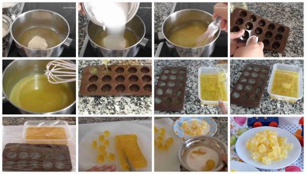 Es muy sencillo preparar estas gominolas de piña, también se pueden hacer de otros sabores para ello tan solo tenéis que cambiar el sabor de la gelatina y utilizar zumo del mismo sabor o la misma cantidad de agua; en este último caso doblaremos el azúcar.En un cazo echamos todos los ingredientes; el sobre de preparado de gelatina, la gelatina neutra, el zumo de piña y el azúcar. Ponemos a fuego medio y movemos de vez en cuando, con precaución de que no llegue a hervir.
