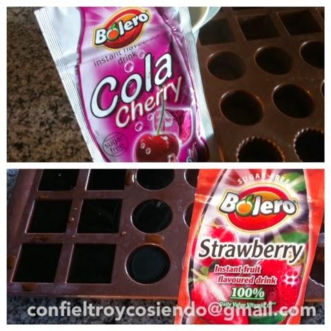 Ponemos la gelatina en polvo en una taza y cubrimos con el agua caliente hasta que se disuelva por completo. Añadimos las cucharaditas de bebida bolero, en mi caso de cola cereza y disolvemos. Ahora lo vertemos en moldes de silicona y dejamos enfriar unas 4h.