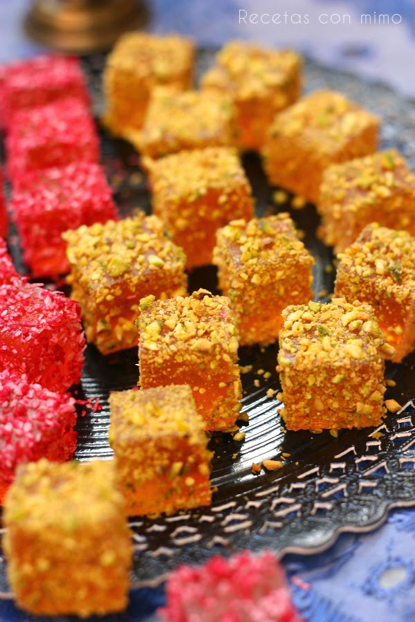 Aquéllas gominolas que ví eran Delicias turcas o Lokum, y como decía yo he hecho mi versión al estilo de los lokum. Las originales se rebozan con azúcar glass principalmente, También se rellenan de algún fruto seco.