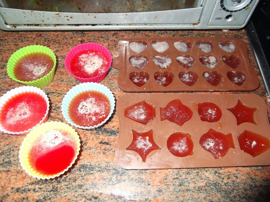 En unos moldes de silicona, los mismos que utilizamos para realizar bombones, los pincelamos con aceite de girasol. Una vez que la mezcla está hecha, poco a poco la depositamos en los moldes, metemos a la nevera durante 12 horas para que cuaje y ya están listas para tomar. Se pueden rebozar en más azúcar, aunque personalmente me gustan más solas. En este caso las hice de gelatina de fresa, pero eso podéis escoger el sabor que más os guste.