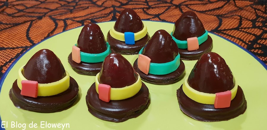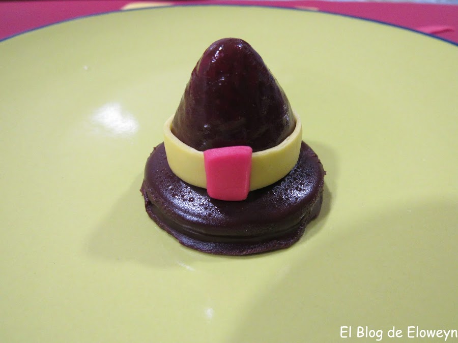 Dejamos unos segundos para que caiga el exceso de chocolate y luego ponemos con cuidado la base del gorro sobre una lámina de papel para hornear.