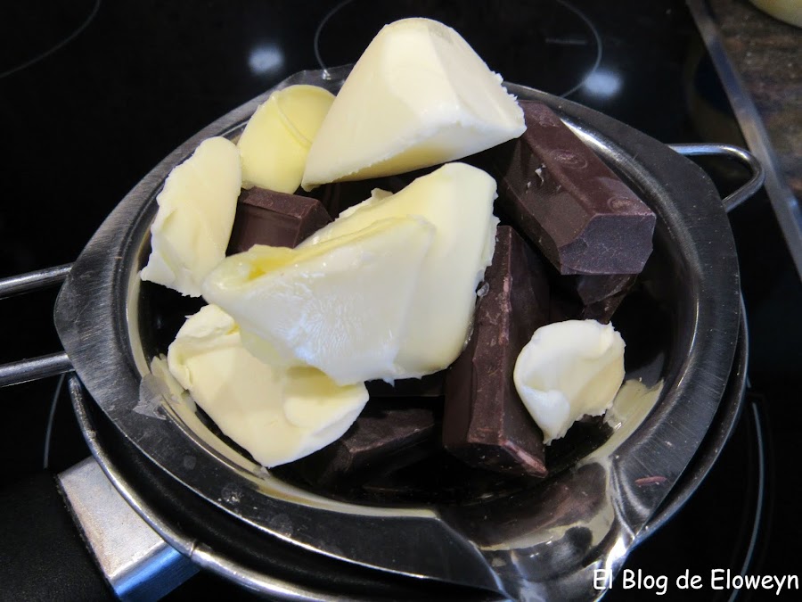 Mientras se va secando la base, ponemos un poco de agua en un recipiente para hacer un baño María en el que derretir el chocolate y la mantequilla.