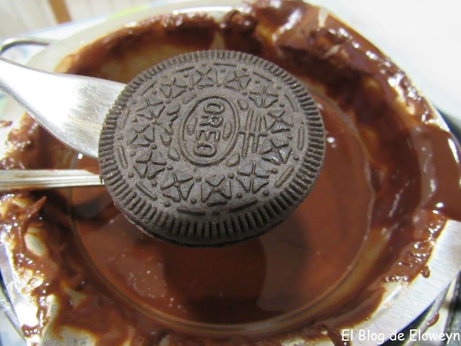 Introducimos la galleta Oreo dentro del chocolate completamente y la volvemos a sacar con ayuda del tenedor.