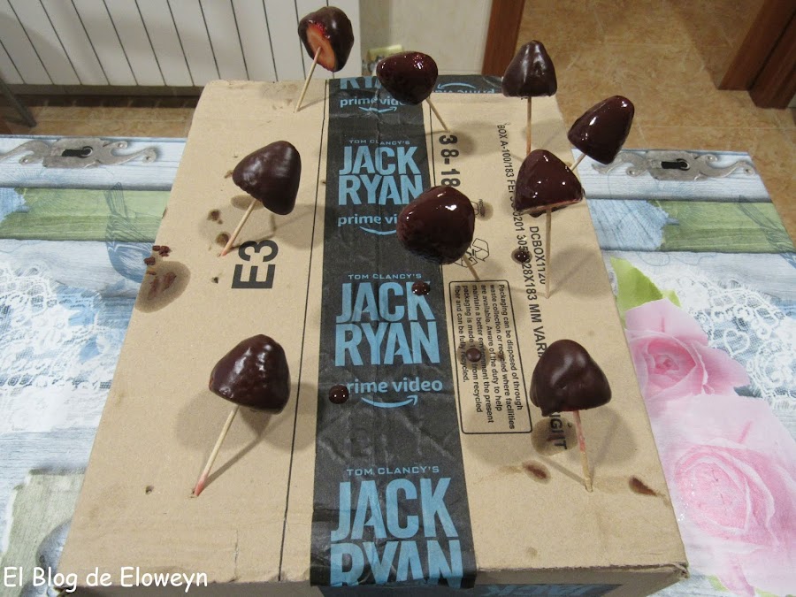 Ponemos los palillos con las fresas cubiertas de chocolate en un trozo de porexpan, o en su defecto (os juro que pensaba que tenía porexpan... qué vergüenza... jajaja) una caja de cartón o similar, para que se sequen las fresas. Cuidado de que las fresas con chocolate no toquen nada. Podéis forrar la caja de cartón con papel de aluminio... yo lo pensé después... jajaja.