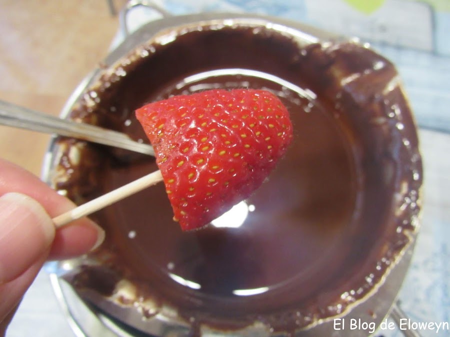 Sumergimos la fresa en el chocolate dejamos que elimine el exceso (con cuidado de que no se nos caiga la fresa)