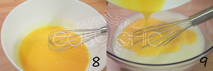 9. Mezclamos las yemas con la mezcla anterior del almibar con la leche y la harina. Lo haremos cuando esta mezcla este un poco templada y no muy caliente.