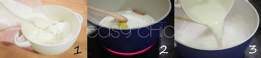 3. Cuando empiece a hervir la leche de la cazuela, añadiremos la mezcla de el resto de la leche con la harina (1) y removeremos poco a poco a fuego medio, hasta espesar un poco la mezcla.