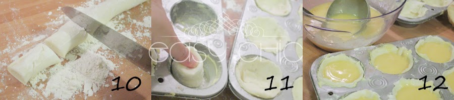 11. Tras engrasar y enharinar los moldes típicos de magdalenas para que no se peguen nuestros pasteles, cogeremos cada una de estas secciones y las aplastaremos sobre los huecos del molde para crear la base de los pasteles. Procurar que os quede lo suficientemente fino porque sino después el pastel tendrá demasiado hojaldre y no quedará un suficiente equilibro de sabores entre el hojaldre y la crema.