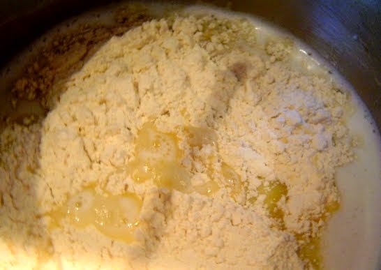 Echamos la harina toda a la vez y mezclamos con una cuchara de madera,