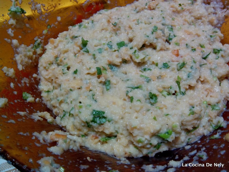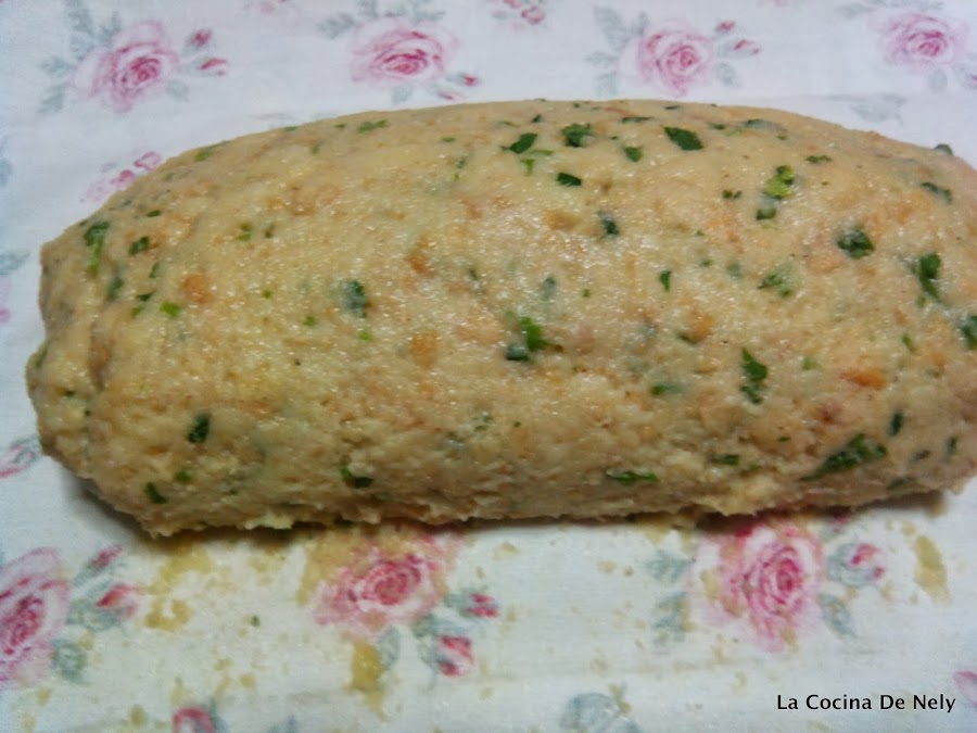 Batimos los huevos con la leche la sal, la pimienta y la nuez moscada y lo vertemos por encima del pan. Dejamos reposar un poco y amasamos bien hasta deshacer todo el pan y que quede como una papilla.