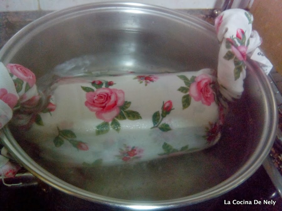 Ponemos una olla a hervir con agua salada y una vez este hirviendo se mete dentro hasta que el agua cubra el paño y se baja hasta que no hierva fuerte y se deja cocer durante 25 min.
