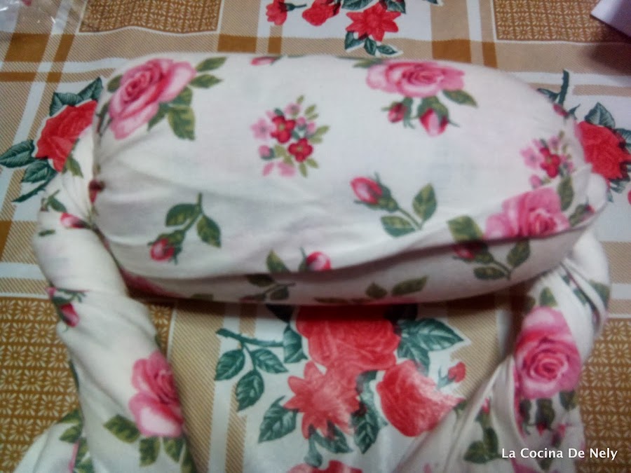 Y vamos dando vuelta al paño para hacer una forma de cilindro como se ve en la imagen.
