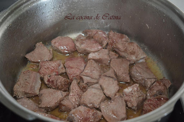 Salpimentamos la carne y la freímos a fuego fuerte hasta que esté dorada por todos los lados.