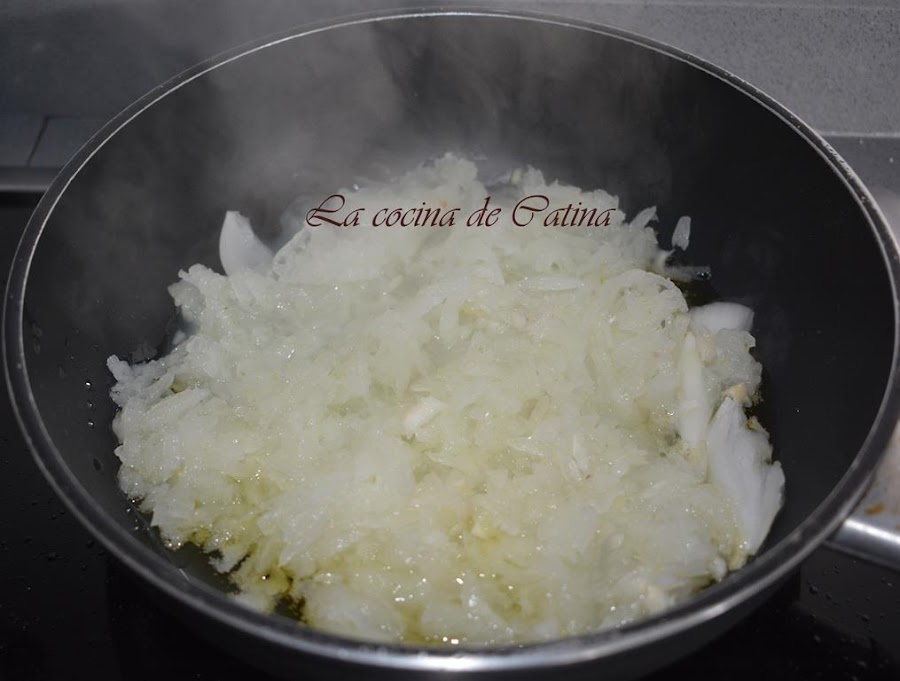 En una sartén aparte, calentamos el resto del aceite, echamos la cebolla pelada y picada y la salteamos durante 7 u 8 minutos, hasta que esté blandita y dorada.
