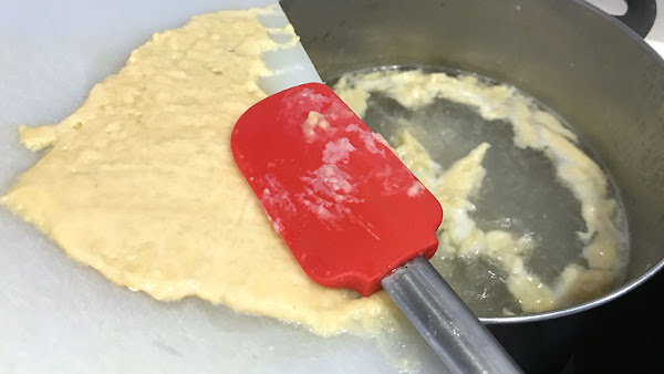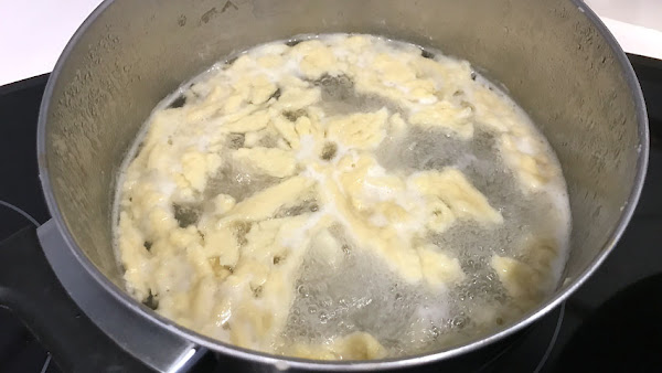 La masa se pone en el borde de una tabla y se va humedeciendo y cortando con la espátula para echarla en la olla de agua hirviendo hecha "jirones".