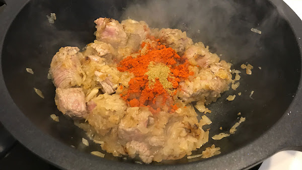 Cuando la carne esté dorada exteriormente añade el pimentón (paprika) y el comino.