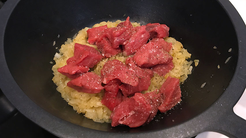 Incorpora la carne al caldero subiendo el fuego y moviendo para que la carne se dore sin que se queme.